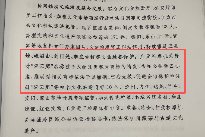 2月4日下午,在四川省第十四届人民代表大会第五次会议第二次全体会议的会场上,四川省人民检察院工作报告提及:“广元检察机关针对‘翠云廊’名称被个人抢注囤积为商标的情况,依托公益诉讼办案,推动对相关商标依法予以撤销、宣告无效,促进全市保护性注册‘翠云廊’等知名文化旅游商标30个。”