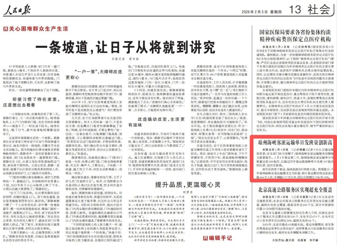 记者4日从交通运输部获悉:在各部门协力保障下,琼州海峡客滚运输服务保障能力显著提升。2月3日春运第二日,琼州海峡客滚运输单日发班量达到338航次,已超过历年春运最高峰单日发班337航次的纪录,创历史新高。