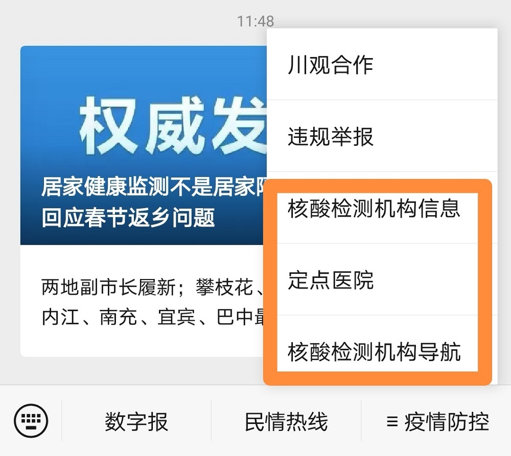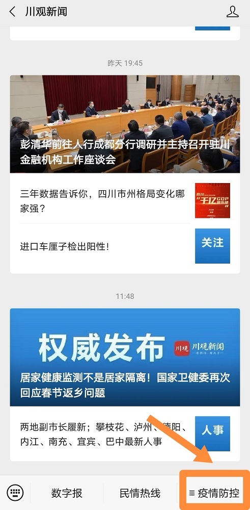 关注微信公众号“川观新闻”,点击菜单栏“疫情防控”。