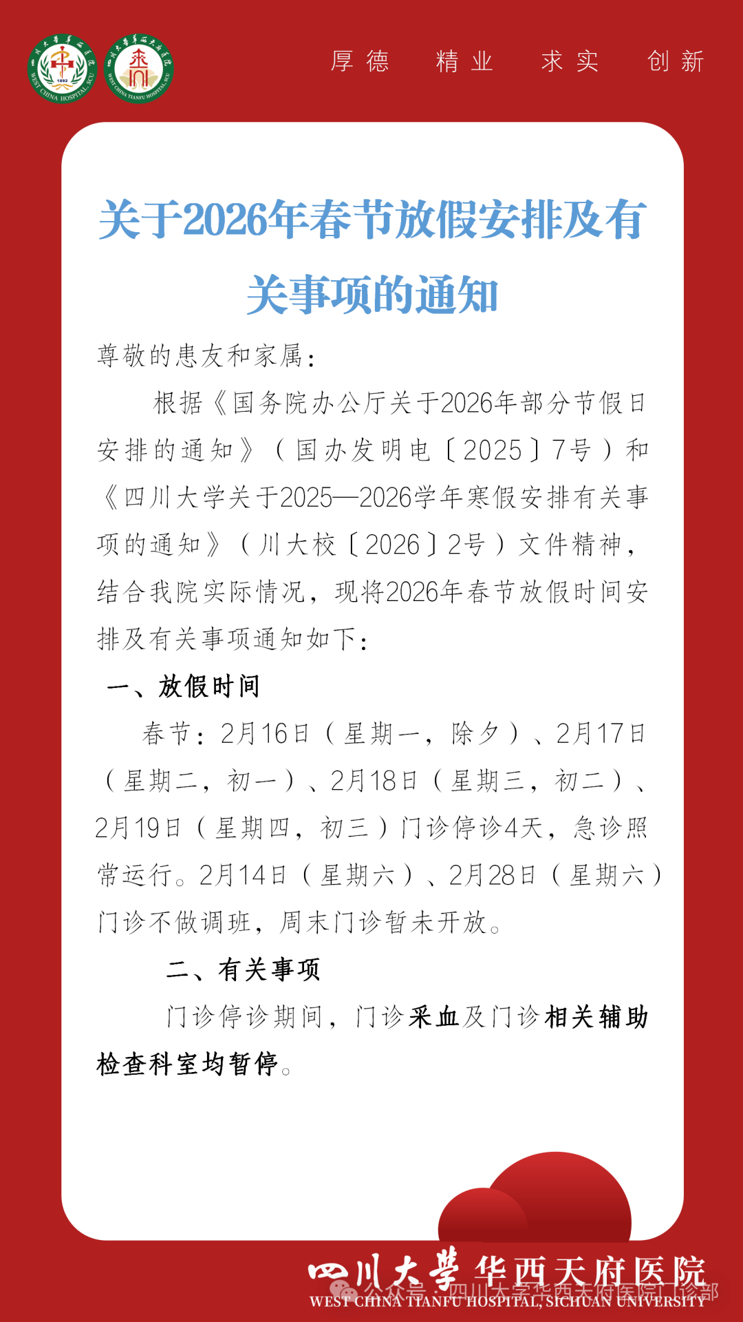 四川省人民医院健康管理中心2026年春节放假安排通知如下: