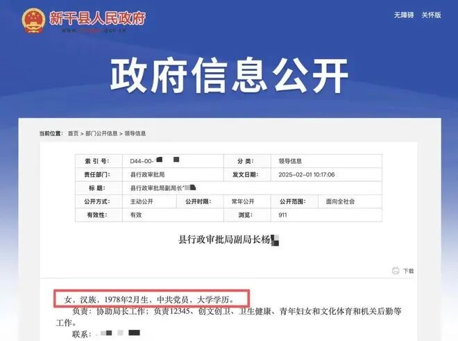 该则干部任前公示显示,杨某出生于1982年7月,无党派,而在新干县政府官网行政审批局信息公开页面中,杨某出生于1978年2月,是中共党员,并下附了杨某的办公联系电话。