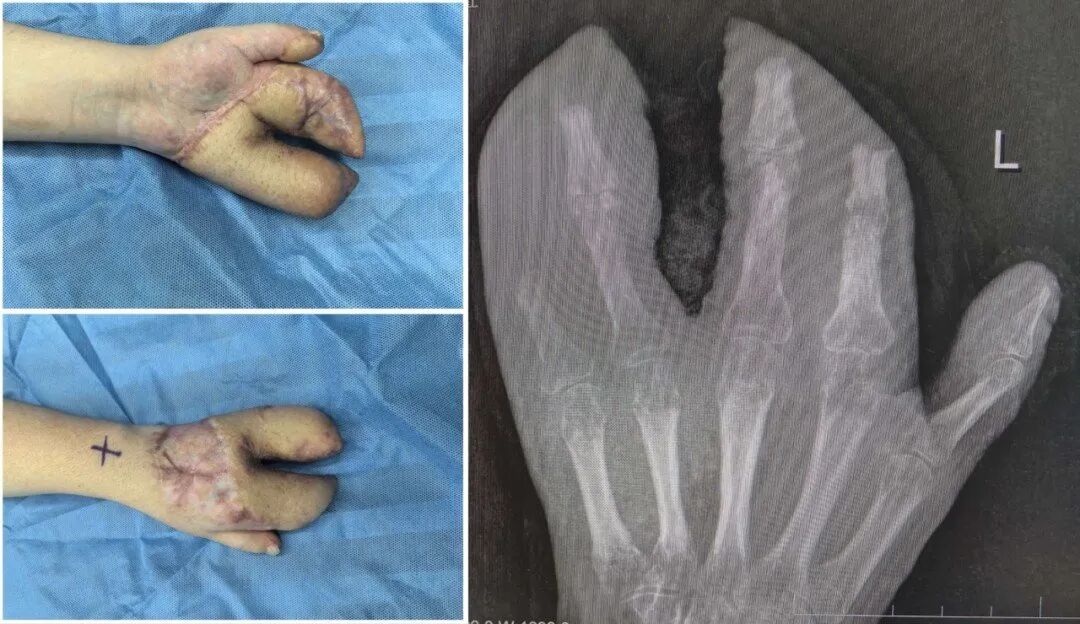 等待皮瓣完全稳定后,医生们开始了功能重塑。手术将臃肿的皮瓣进行修薄塑形,并进行了首次分指术,把粘连在一起的手指分开,同时取出了已愈合的骨折内固定物。