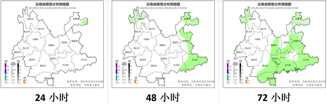 2月5日20时至2月6日20时:迪庆州北部的高海拔地区多云局部有小雪或雨夹雪,昭通市北部多云局部有小雨,其他地区晴间多云。