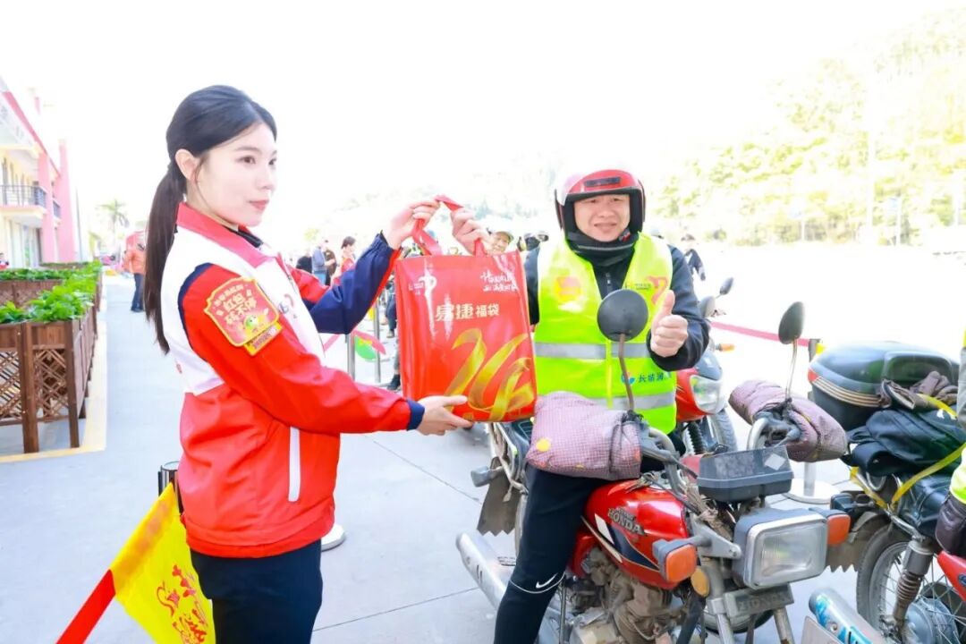 在广东地区,中国石化设立100座“情暖驿站”,为在粤务工摩骑人员提供1000份“免费加油包”,包括一次免费加满油箱服务,以及由易捷、长城润滑油、太平财险等企业赞助的福袋(含食品、饮料、意外险)和反光背心、骑行雨衣、保温杯组成的“温暖三件套”。广东邮政速递物流同步提供1000份20公斤以内年货包裹免费邮寄服务,助力返乡行李“轻装上路”。