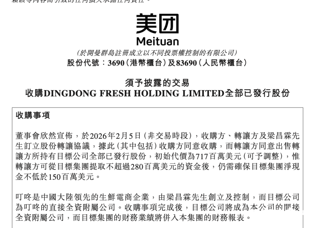 即时零售行业迎来平地一声雷。2月5日傍晚,美团发布公告称,美团已经与叮咚买菜及其创始人梁昌霖签订了股份转让协议,拟以7.17亿美元(约合人民币49.89亿元)的初始代价收购叮咚买菜中国业务100%的股权。此次交易,叮咚买菜的估值为10.06亿美元,收购完成后,叮咚买菜将成为美团的间接全资附属公司,其财务业绩将并入美团的财务报表。