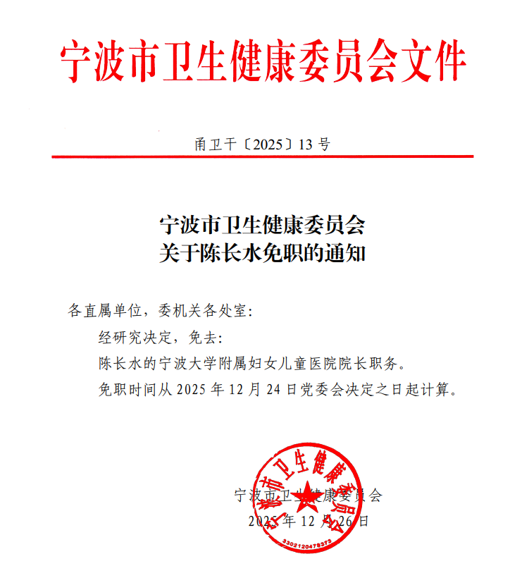 通知称,经研究决定,免去:陈长水的宁波大学附属妇女儿童医院院长职务。免职时间从2025年12月24日党委会决定之日起计算。