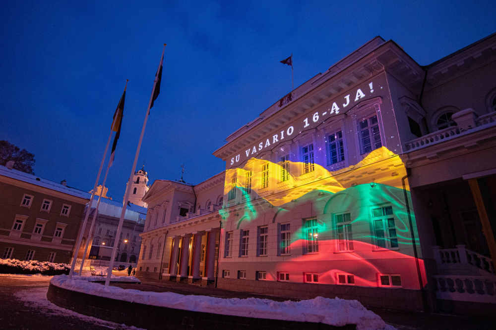 2021年2月16日,立陶宛总统府在灯光秀中被投射上国旗颜色的灯光。新华社发(阿尔弗雷达斯·普里亚迪斯摄)