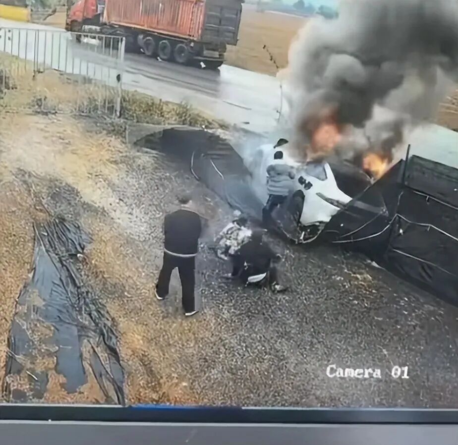 监控视频显示,周围都是田野,道路周围几乎没有建筑。中午11时59分,一辆白色轿车疑似失控,撞向路旁的护网。11时59分41秒,主驾驶位司机打车门下车,车身开始冒起黑色烟雾。