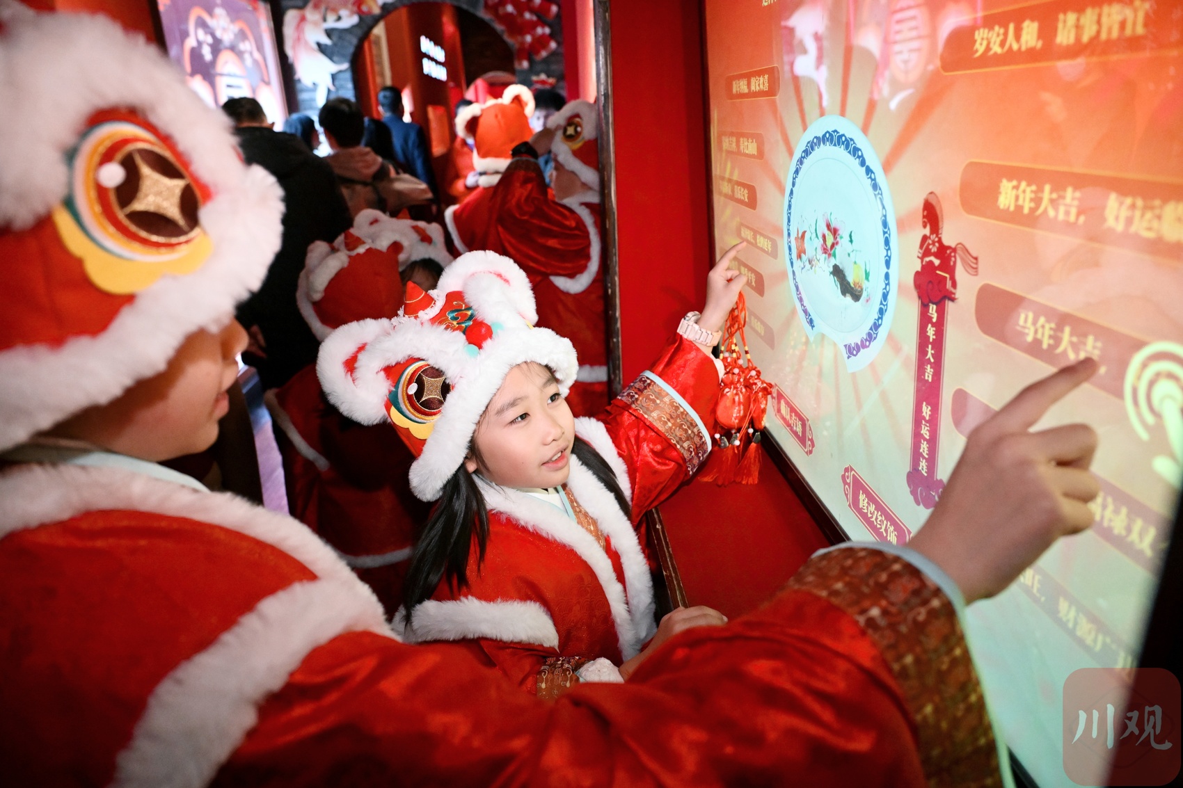 身着“小喜神”服饰的小朋友正在展览互动屏前参与接福互动。