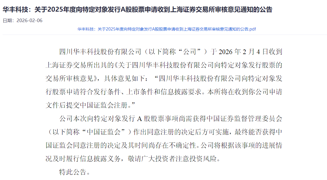 根据华丰科技最新发布的公告称,公司于2026年2月4日收到上海证券交易所出具的《关于四川华丰科技股份有限公司向特定对象发行股票的交易所审核意见》,具体意见如下:“四川华丰科技股份有限公司向特定对象发行股票申请符合发行条件、上市条件和信息披露要求。本所将在收到你公司申请文件后提交中国证监会注册。”
