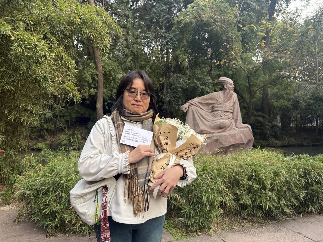 两年时间里,黎芯菱去到了苏东坡待过的杭州、黄州等地,但一直没有机会前来东坡老家眉山。今年寒假,趁着“寿苏会”,黎芯菱提前2天来到眉山,一大早还专门手捧鲜花前来。