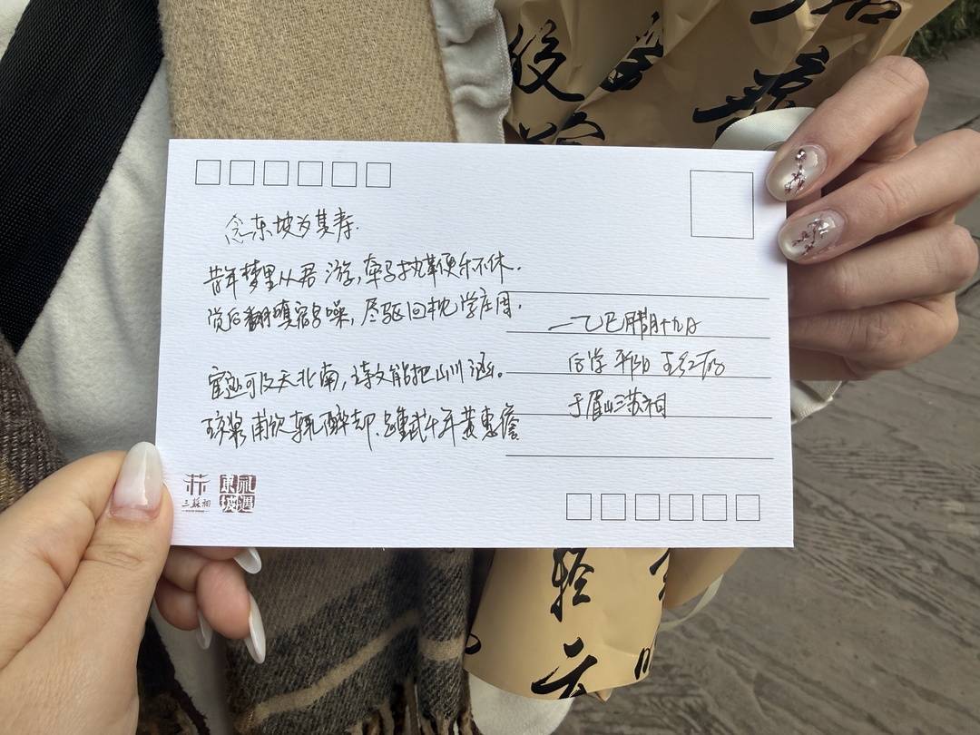 “这是我给苏东坡写的两首诗,本来有4首,但明信片太小,写不下了。”王红丽说,“他就是我的人生偶像,特别是在遇到挫折的时候,我一想到他经历那么多事情都能豁达乐观,我也会觉得没什么过不去的。”