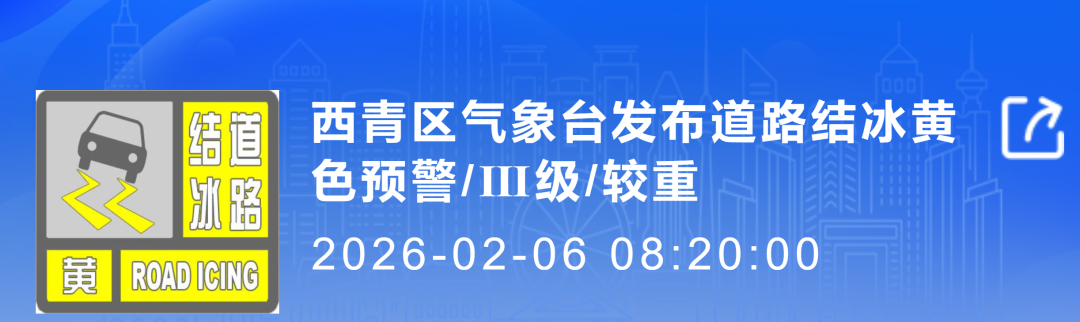 西青区气象台于2026年02月06日08时20分发布道路结冰黄色预警信号:预计未来24小时内我区中南部街镇特别是精武镇、大寺镇、王稳庄镇易形成道路结冰,请有关单位和人员作好防范准备。