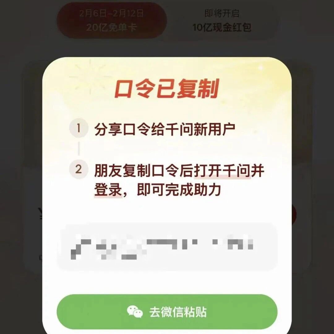 2月6日,阿里千问正式上线“春节30亿免单”,发放奶茶免单卡。记者发现,继微信封杀自家腾讯元宝、百度文心助手后,千问的红包分享链接也被微信屏蔽,页面显示网页存在诱导或误导下载/跳转的内容,需要跳转第三方浏览器访问。同时,部分用户在千问APP点击分享活动至微信好友时,已自动改为复制口令形式。