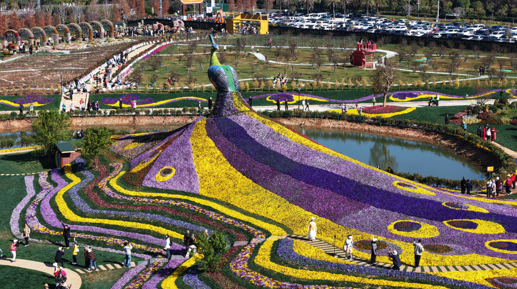 春节前,坐落于昆明市呈贡区斗南滇池湿地公园旁的七彩花海公园2月5日正式对外开放,公园围绕巨型孔雀花雕打造十大特色景观区域,成为滇池沿岸供市民游客赏花休闲的新去处。