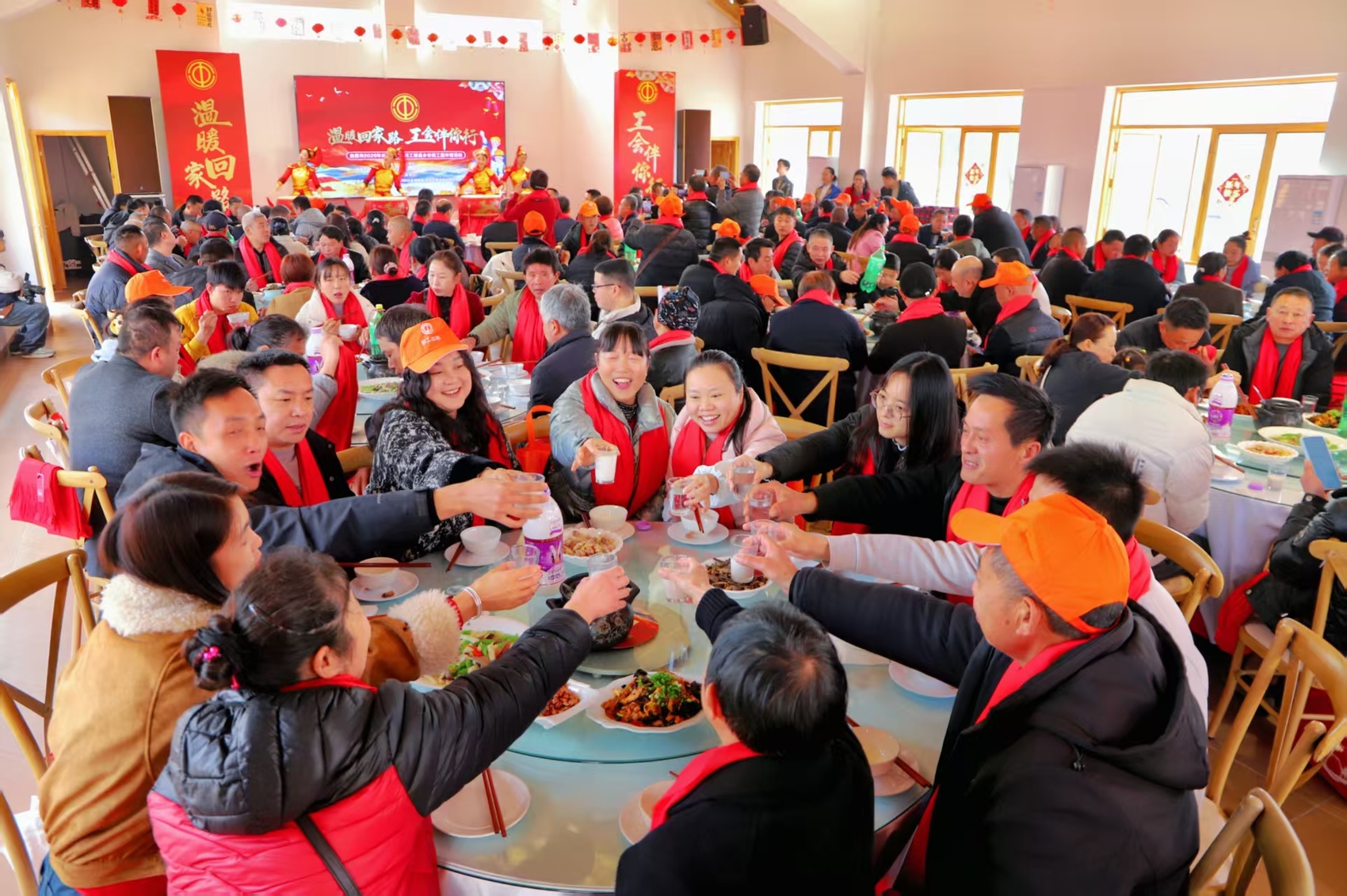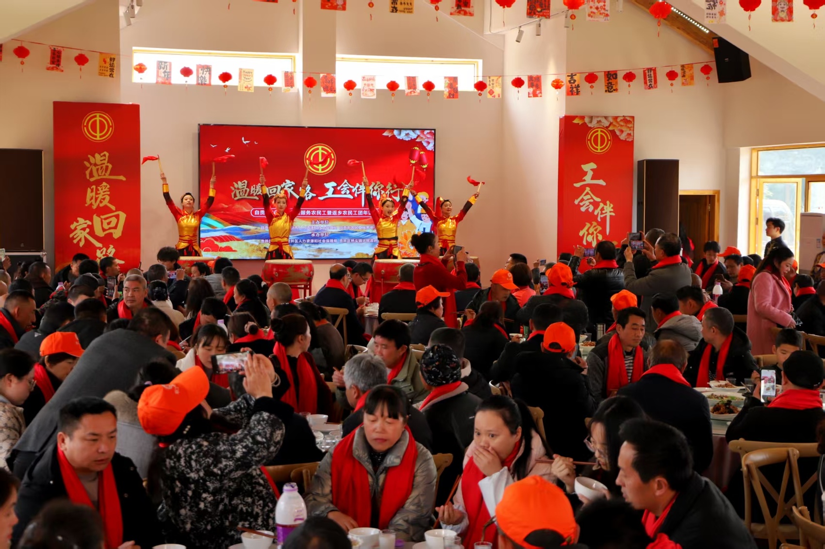 2月6日,自贡市贡井区桥头镇四月阳光农场广场上年味浓郁、欢声阵阵。以“温暖回家路,工会伴你行”为主题的关爱服务农民工暨返乡农民工团年饭活动在此举行。此次活动由自贡市总工会、市人力资源和社会保障局、市农民工服务中心联合举办,百余名自贡籍农民工欢聚一堂,共迎新春、共话乡情、共谋发展。