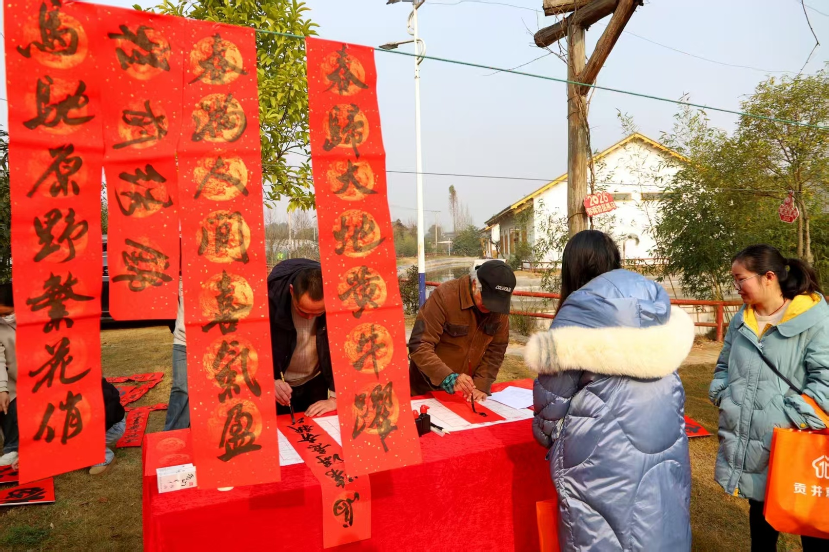 早上10时许,团年饭还未开席,但活动现场已经热闹起来。自贡市书法协会老师在现场挥毫泼墨,将一个个福字贴和新春祝福送给大家,还开设了院坝招聘会,提供厨师、主播、销售、钳工、焊工等岗位供到场农民工选择。政策咨询、义诊下乡等服务台前也吸引了不少人气,为返乡农民工们提供一些实用的帮助和政策信息,让他们在回乡过年的同时,能够更好地了解家乡的发展动态。