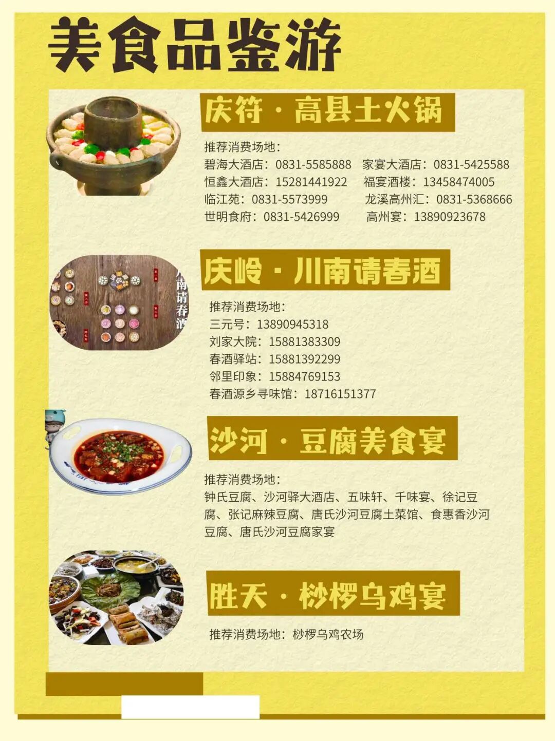 路线:庆符·土火锅→ 庆岭·请春酒→ 沙河·豆腐宴→ 胜天·桫椤乌鸡宴