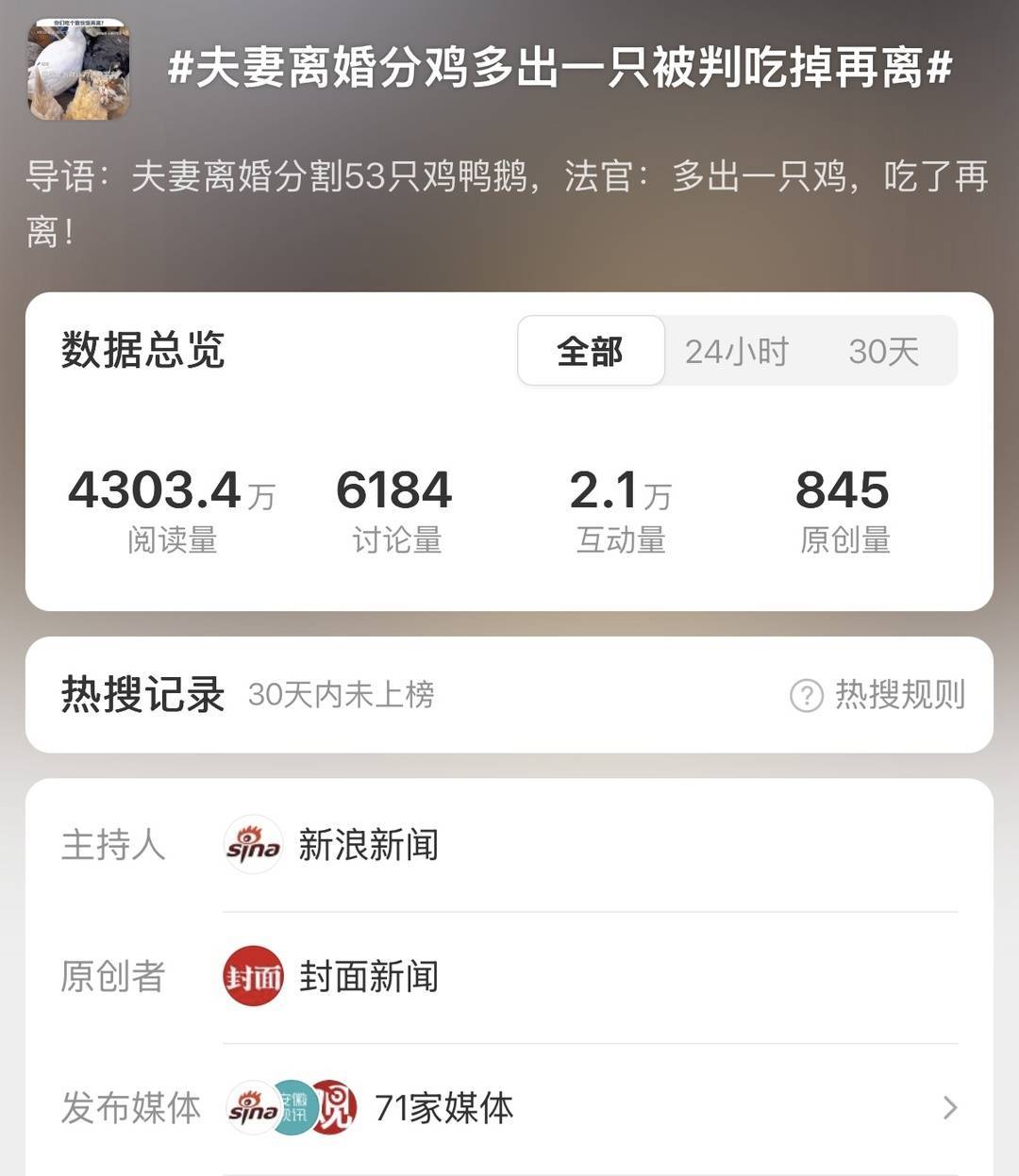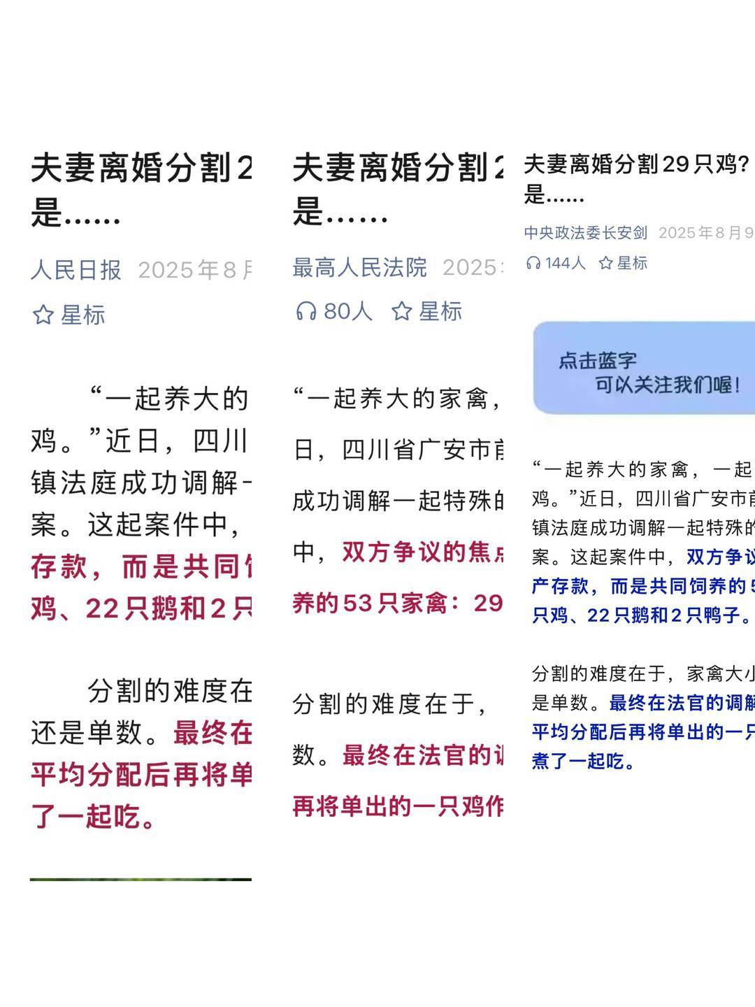 2025年8月5日,封面新闻以《夫妻离婚分割53只家禽 法官:多出一只鸡,吃了再离!》为题,对这起充满烟火气的基层司法实践予以深度关注。