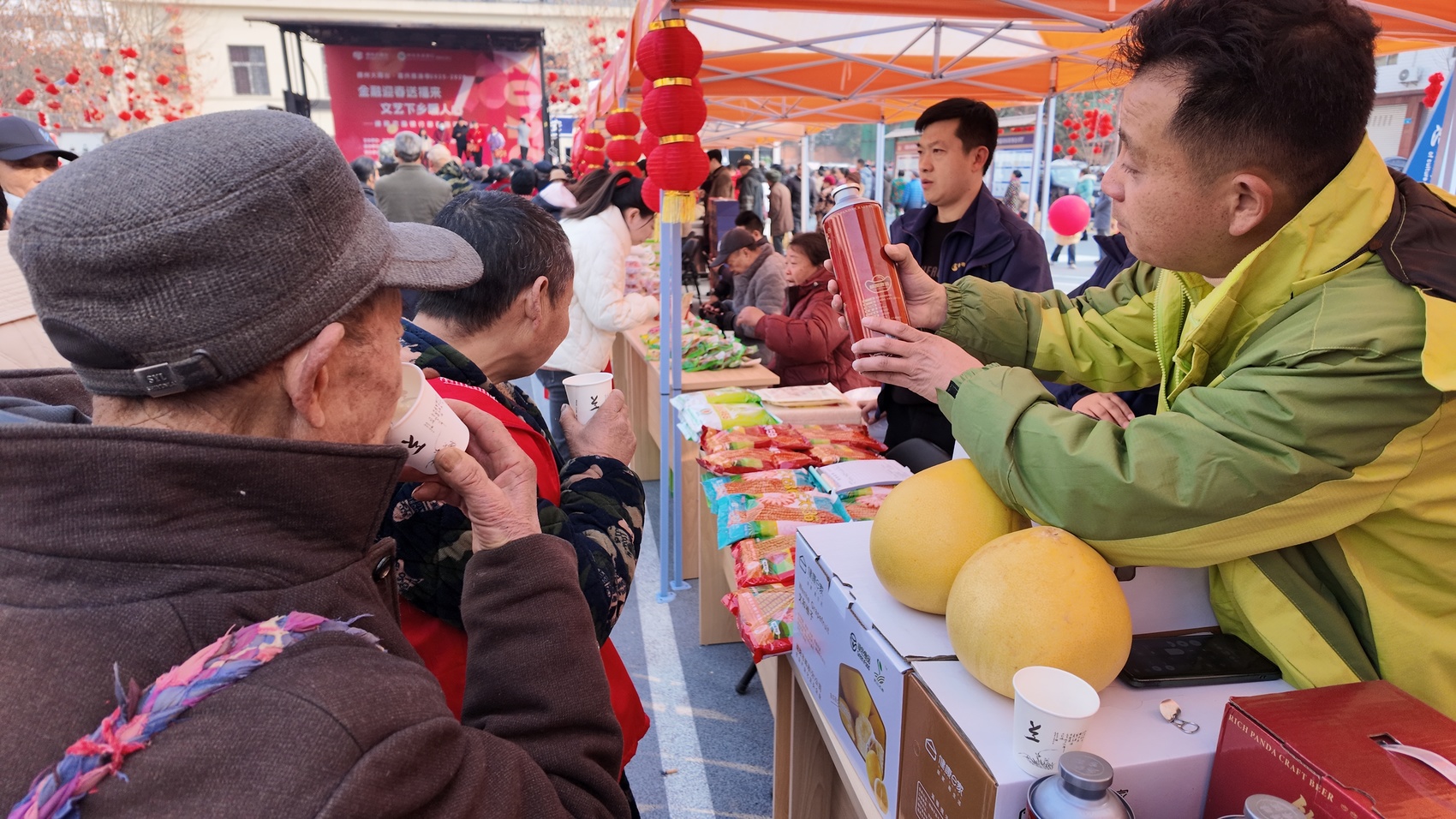 年货区里,吆喝声、笑声、问价声此起彼伏,格外热闹。与往年不一样的是,今年不少摊位前站着的不是商贩,而是各村的“熟面孔”——村干部们纷纷当起了临时“销售员”,热情为本村农特产品代言。