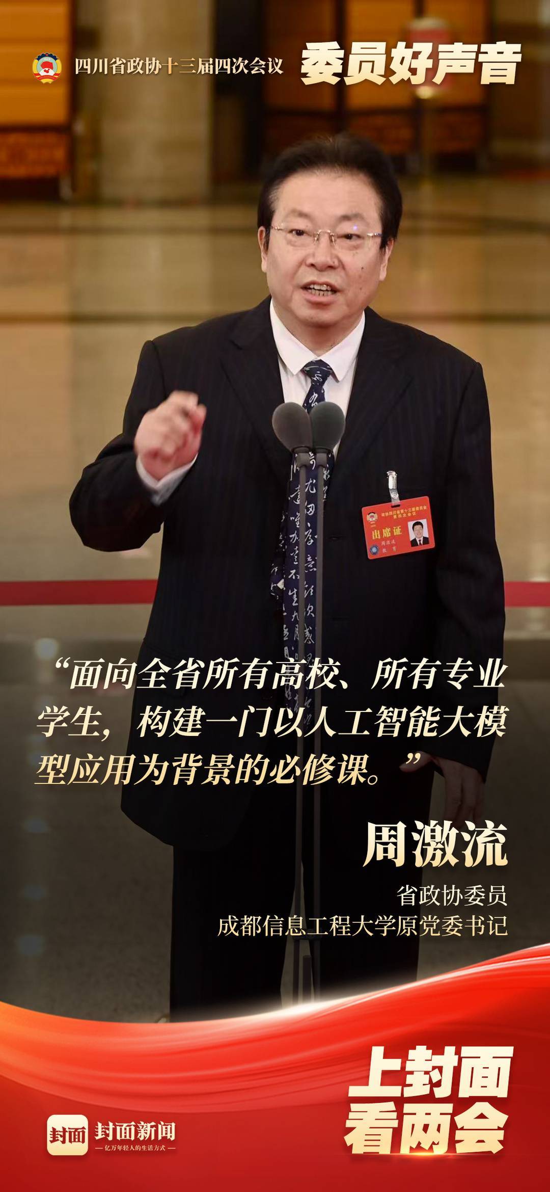 “我在高校从事教学工作和人工智能研究将近40年。”四川省政协委员、成都信息工程大学原党委书记周激流开门见山,抛出了一个关乎四川高等教育未来的命题——人工智能时代,高校如何在鼓励技术应用的同时,更好助力新产业发展?
