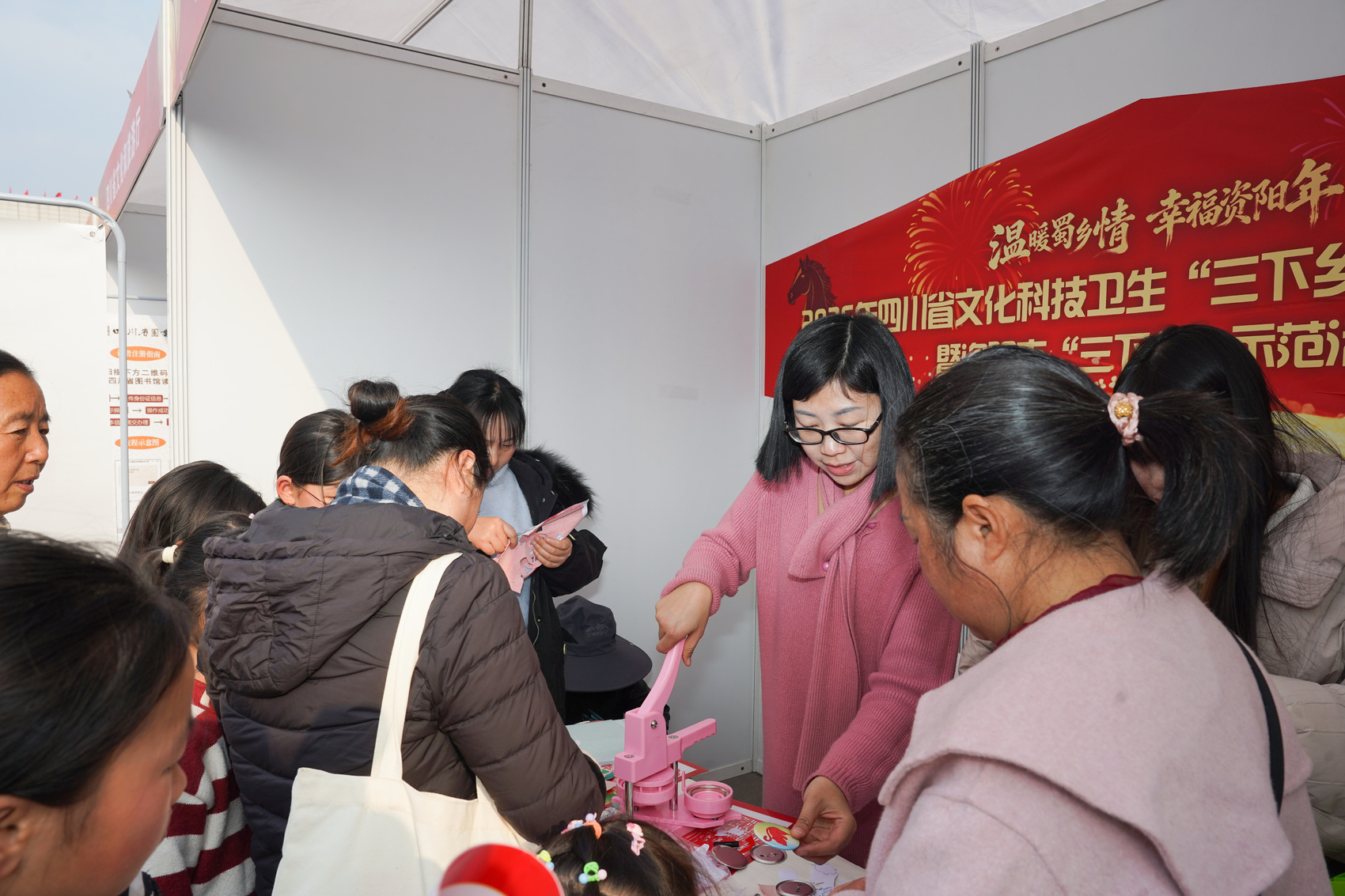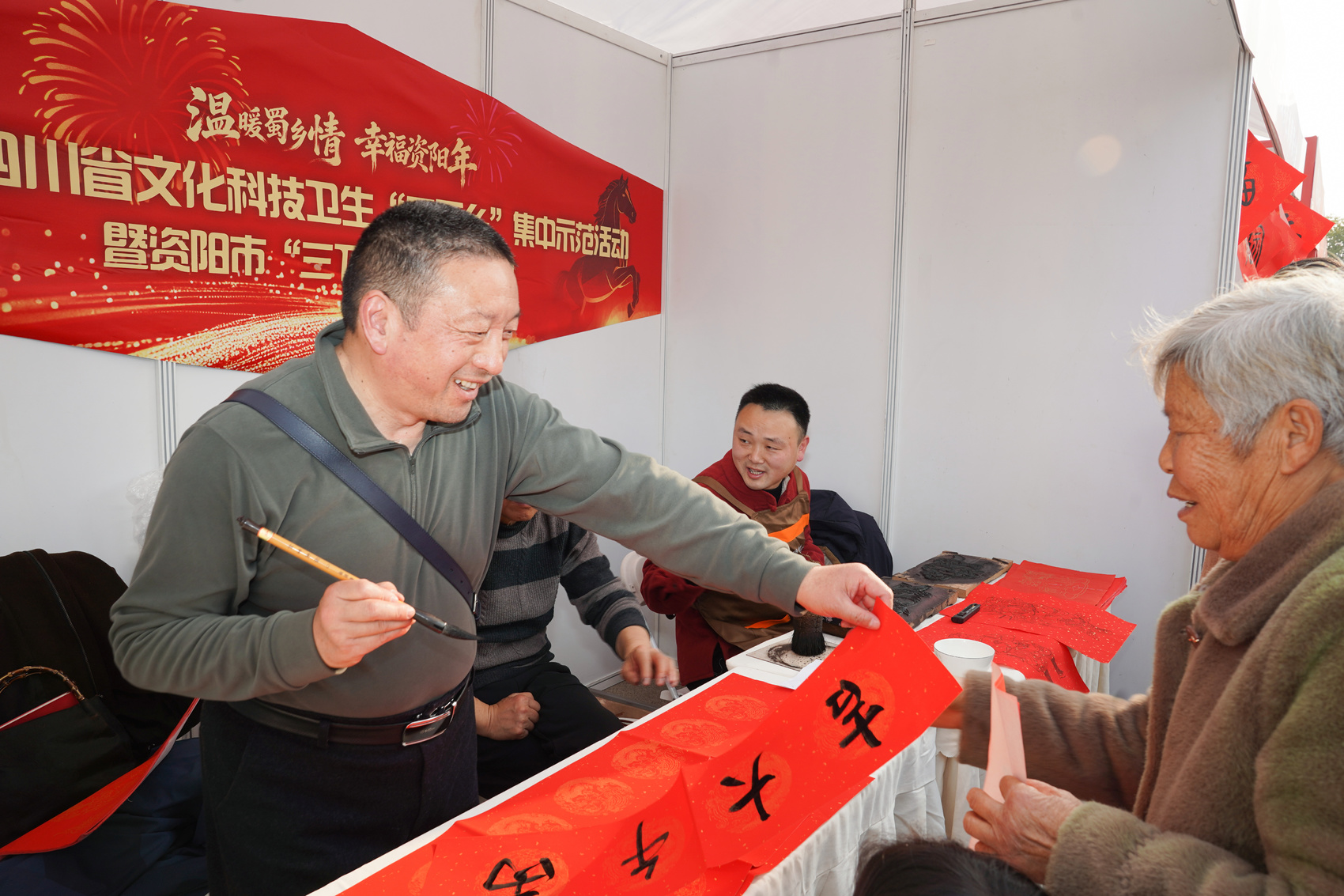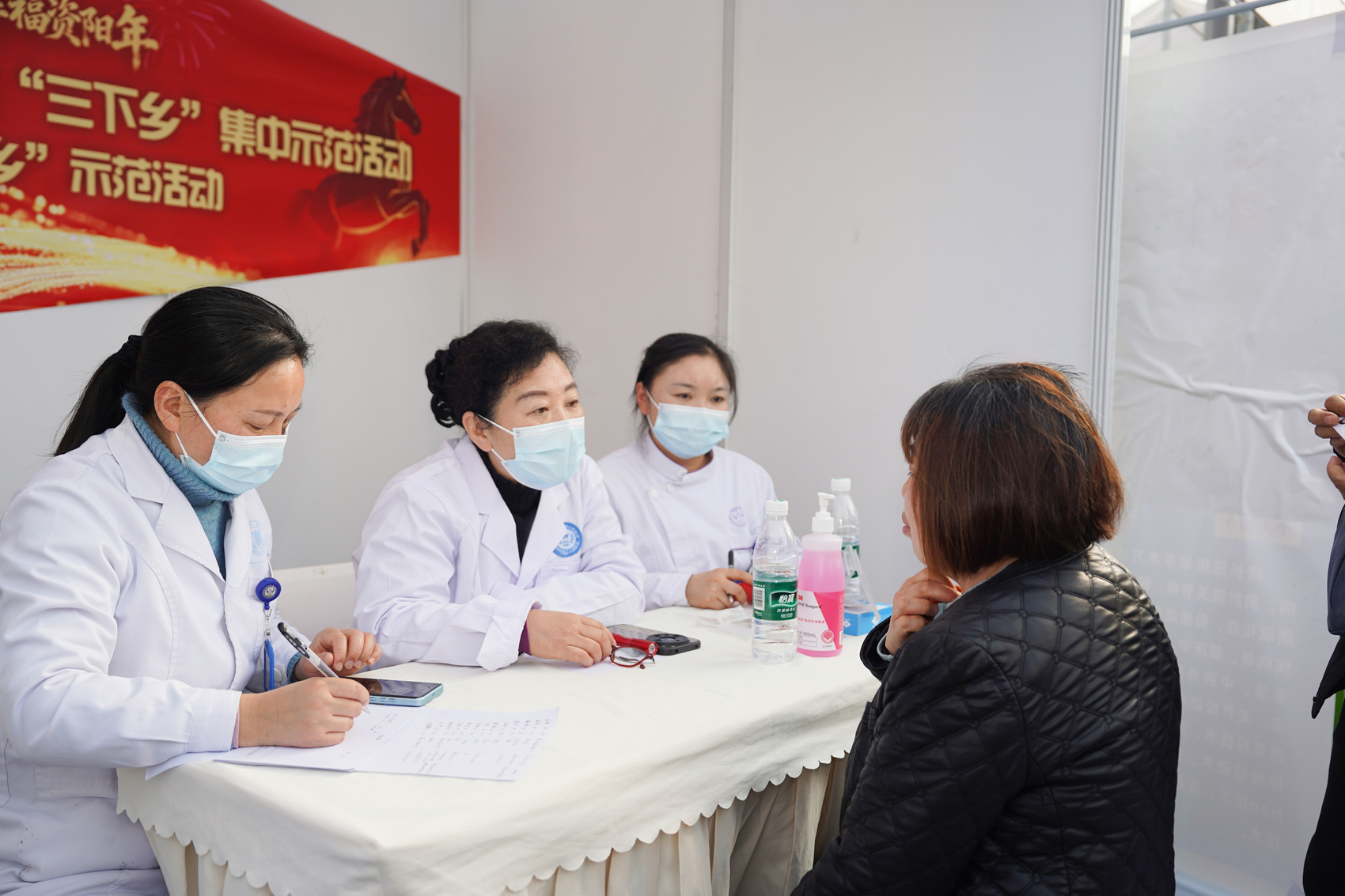 镜头深入展区与人群,记录下最生动的服务瞬间与最火热的活动现场。义诊台前的细致问诊、非遗技艺的巧手展示、手写春联的笔墨送福,与现场涌动的人潮、洋溢的笑脸交相辉映。