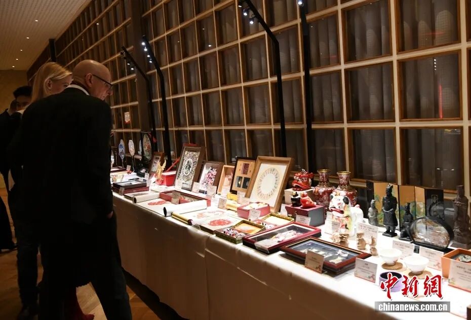 招待会期间进行了中国非物质文化遗产展示,嘉宾纷纷驻足观看。