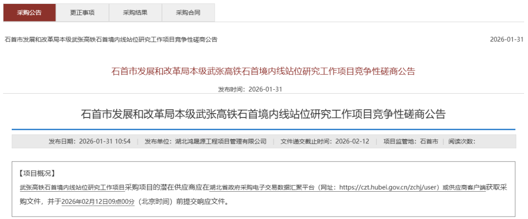 1月31日,石首市发展和改革局《武张高铁石首境内线站位研究工作项目竞争性磋商公告》正式发布,项目预算60万元。武汉至张家界高铁新通道前期工作正加快推进,将为争取纳入国家规划提供技术支撑。公告重点内容如下: