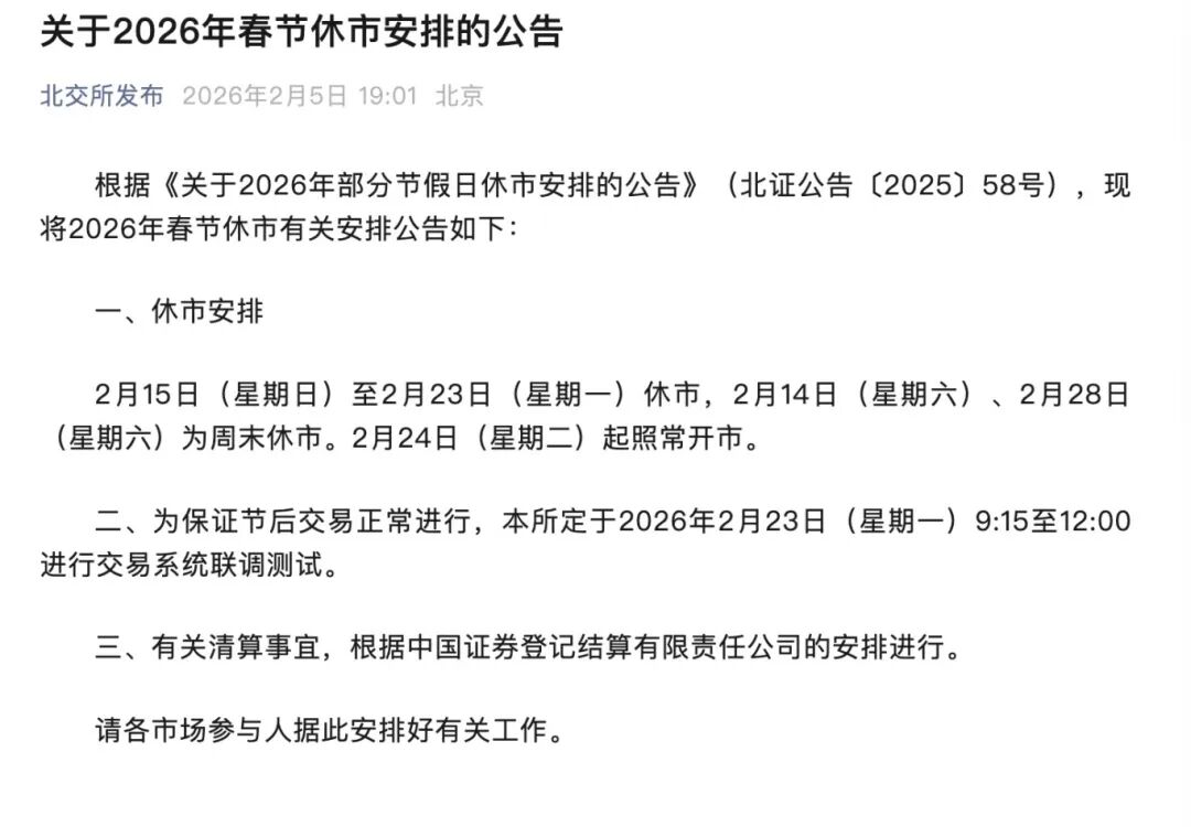 此外,为保证节后交易正常进行,北交所定于2026年2月23日(星期一)9:15至12:00进行交易系统联调测试。