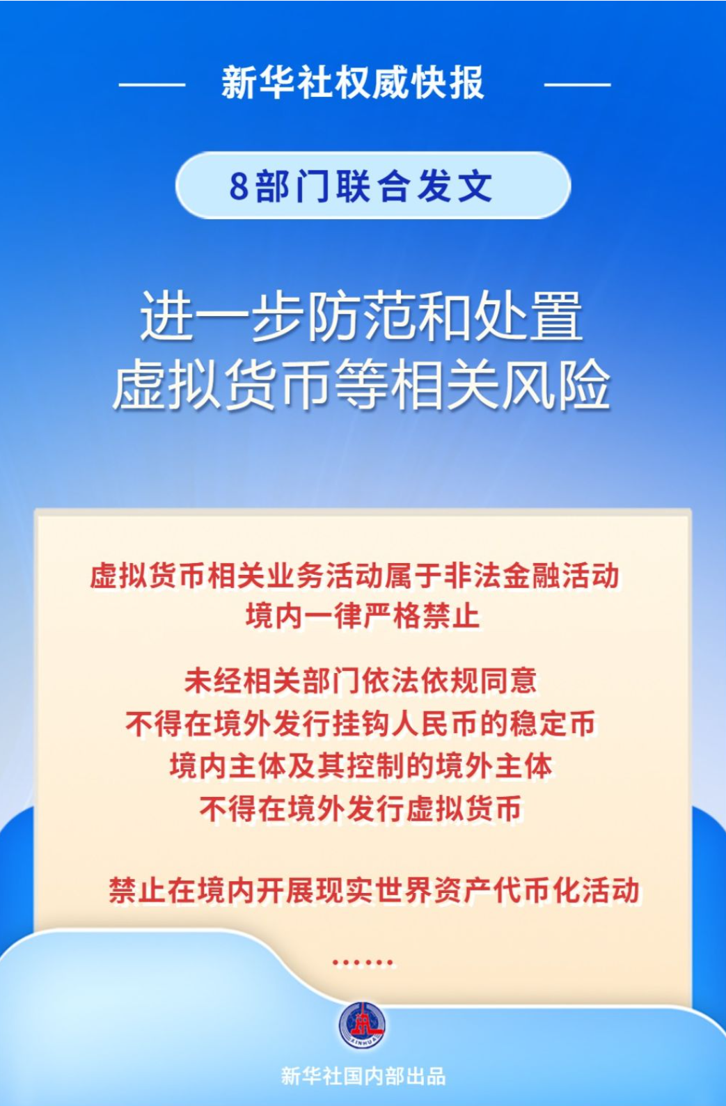 记者2月6日从中国人民银行、中国证监会了解到,中国人民银行等8部门联合发文,明确虚拟货币相关业务活动属于非法金融活动,境内一律严格禁止。未经相关部门依法依规同意,境内外任何单位和个人不得在境外发行挂钩人民币的稳定币,境内主体及其控制的境外主体不得在境外发行虚拟货币。