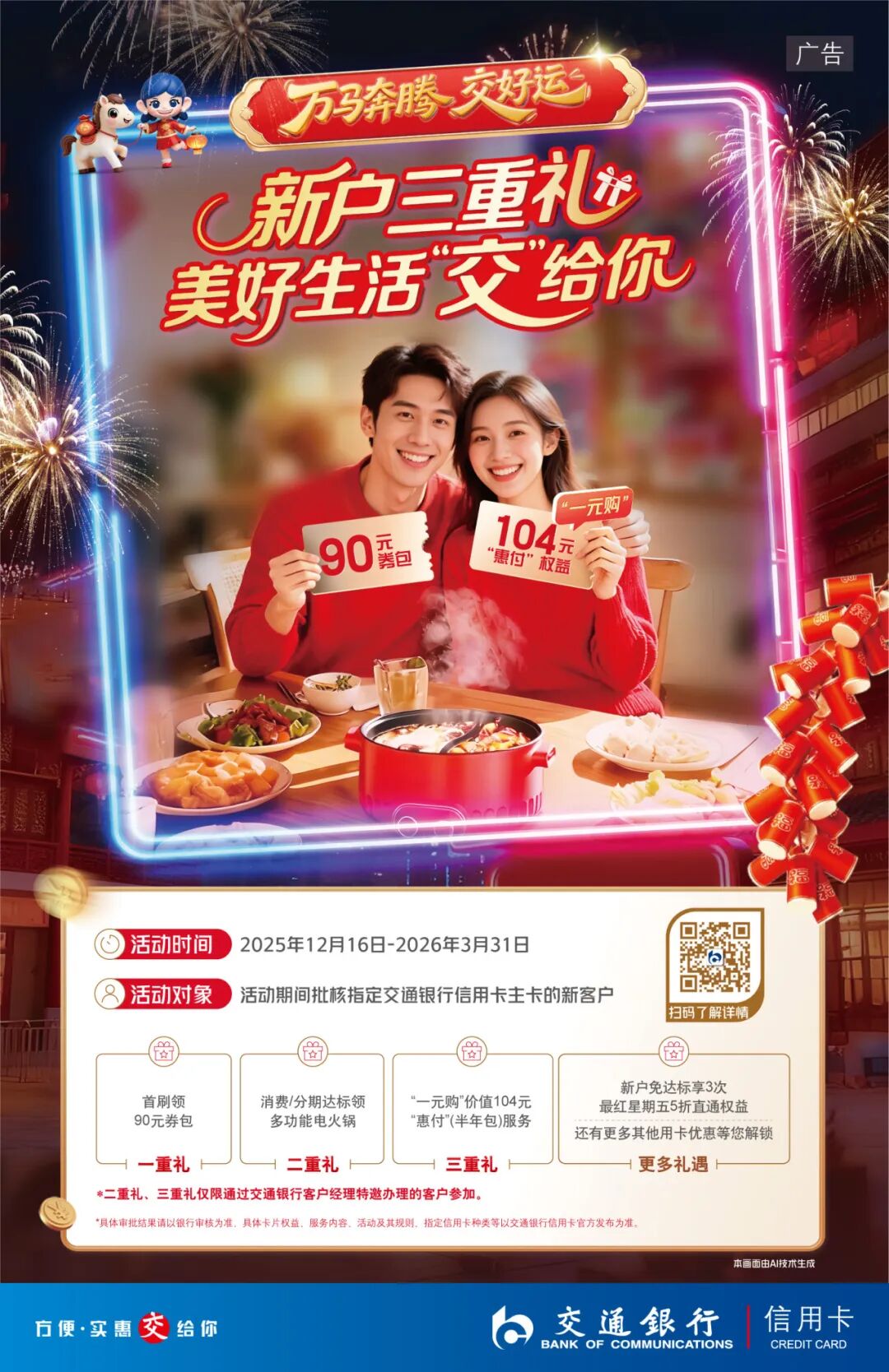 活动期间,交行信用卡新用户消费达标可获移动支付消费券包、电火锅及最红星期五直通权益,覆盖超市、餐饮、出行场景,让年货采购更轻松。
