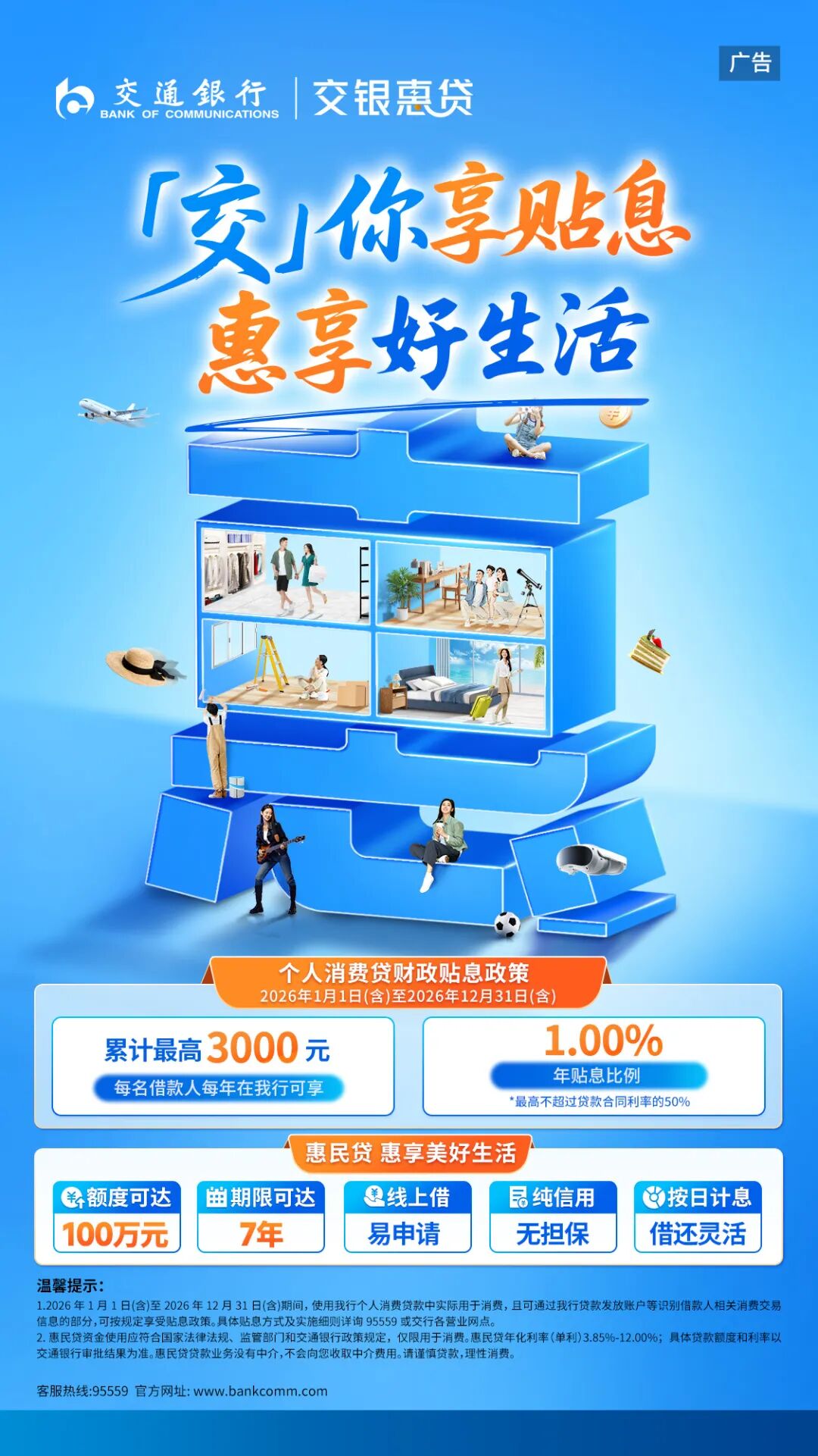 春节是既是阖家团圆的节日,也是共享出游欢乐的美好时刻,交通银行广东省分行推出“惠民贷”产品,为市民解决旅游等资金难题,让团圆之旅更加轻松自在。活动期间,首次申请常规惠民贷且审批通过出额的优选单位客户,享30元微信立减金。