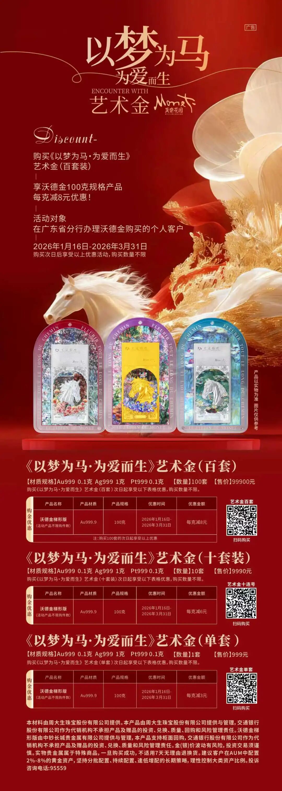 莫奈光影凝金面,骏马奔腾载福来!交通银行广东省分行联合周大生共创推出足金、铂金、足银三种材质贵金属好物,采用星光闪点、CD立体、专属香氛三重工艺,让其兼具收藏与礼赠价值。