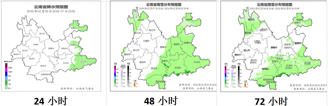 2月6日20时到2月7日20时:昭通市北部、曲靖市东部、文山州东部和南部、红河州东南部多云间阴局地有分散小雨,其他地区晴间多云。