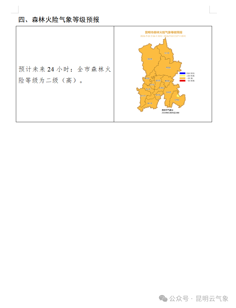 2026年2月6日20时至2026年2月7日20时,怒江州、迪庆州、丽江市、大理州、保山市、德宏州、临沧市、普洱市、西双版纳州、楚雄州、昆明市、玉溪市、红河州、文山州西部、昭通市西南部、曲靖市西部边缘二级,文山州中部、曲靖市中部、昭通市中部三级,其他地区四级。