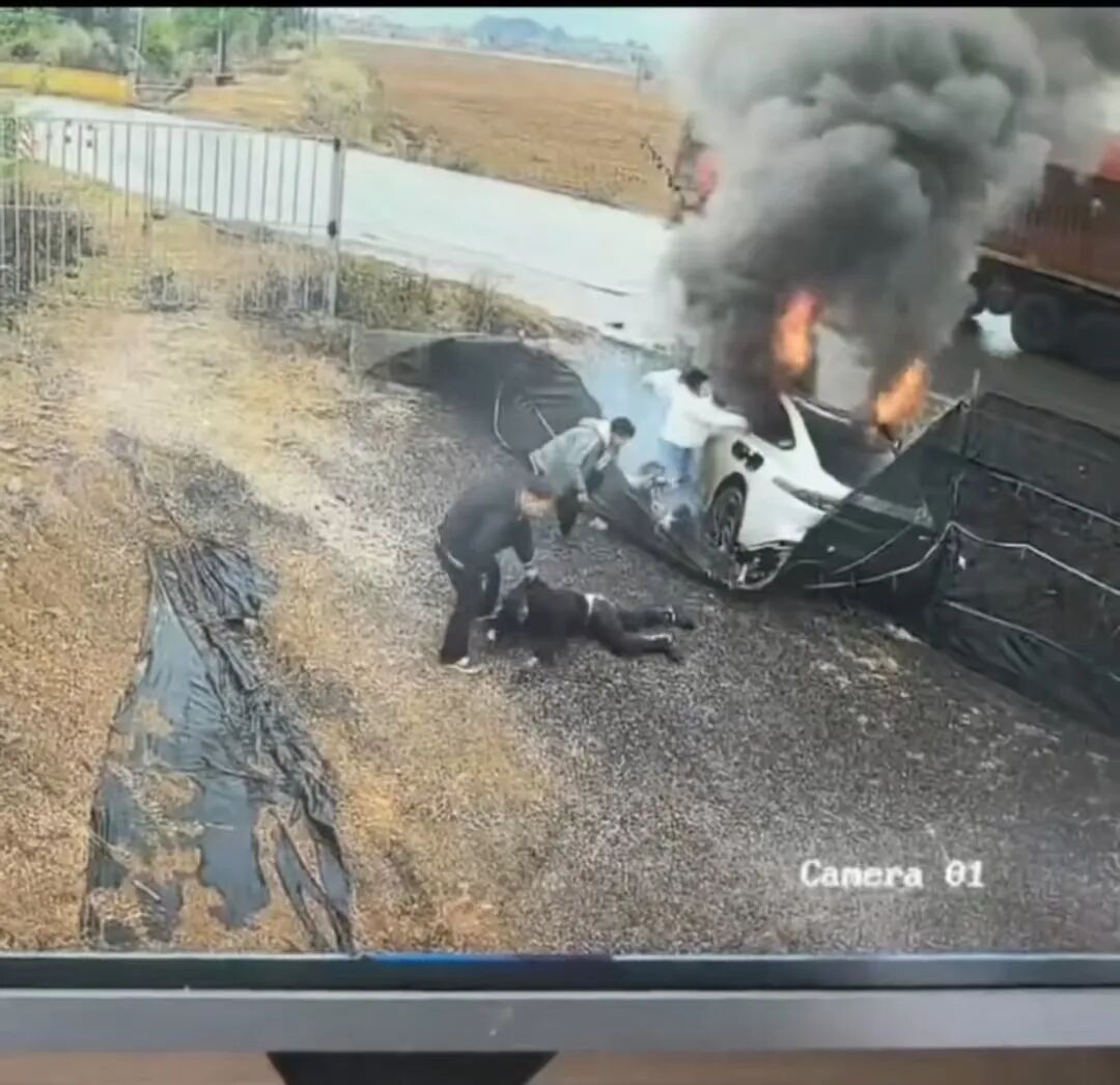 12时0分28秒,白衣男子再次从后排拉出第二名乘客,车辆后排已可见明火从窗户冒出。12时0分35秒前后,白衣男子将手伸进冒火的后车窗,将第三名乘客拖拽而出。此时,车辆火势已经失控,众人将第三名乘客拉离着火车辆。