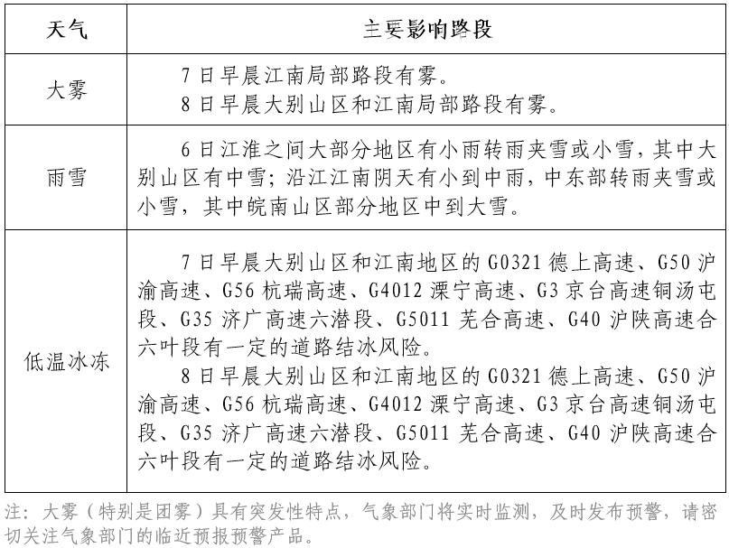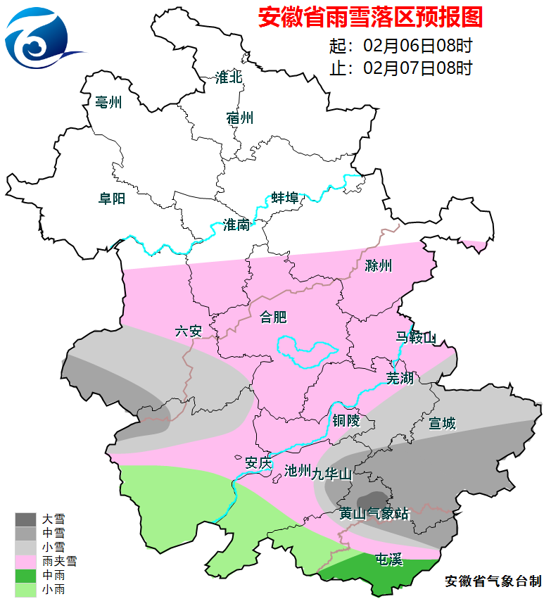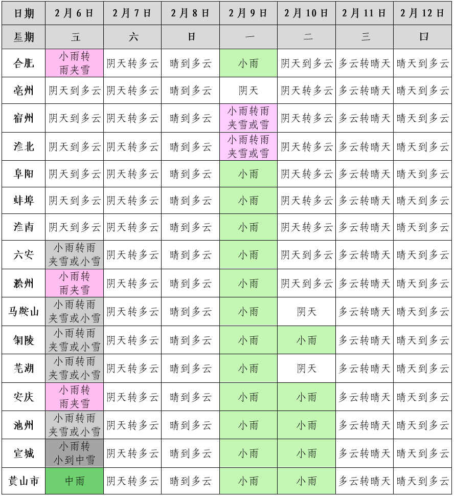 6日:沿淮淮河以北阴天到多云;江淮之间阴天,大部分地区有小雨转雨夹雪或小雪,其中大别山区有中雪;沿江江南阴天有小到中雨,中东部转雨夹雪或小雪,其中皖南山区部分地区中到大雪。