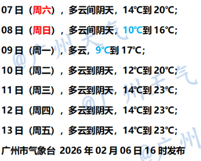 广州市气象台预计,中等强度冷空气2月6日夜间至9日影响广州,广州以多云间阴天为主,日平均气温下降5~8℃,陆地阵风将加大至4~6级,港区和高地阵风6~8级。气温逐日下降,2月9日早晨出现此次降温过程最低气温:北部6~8℃,中部9~10℃,南部11~12℃。2月10日后以多云到阴天为主,气温逐渐回升。