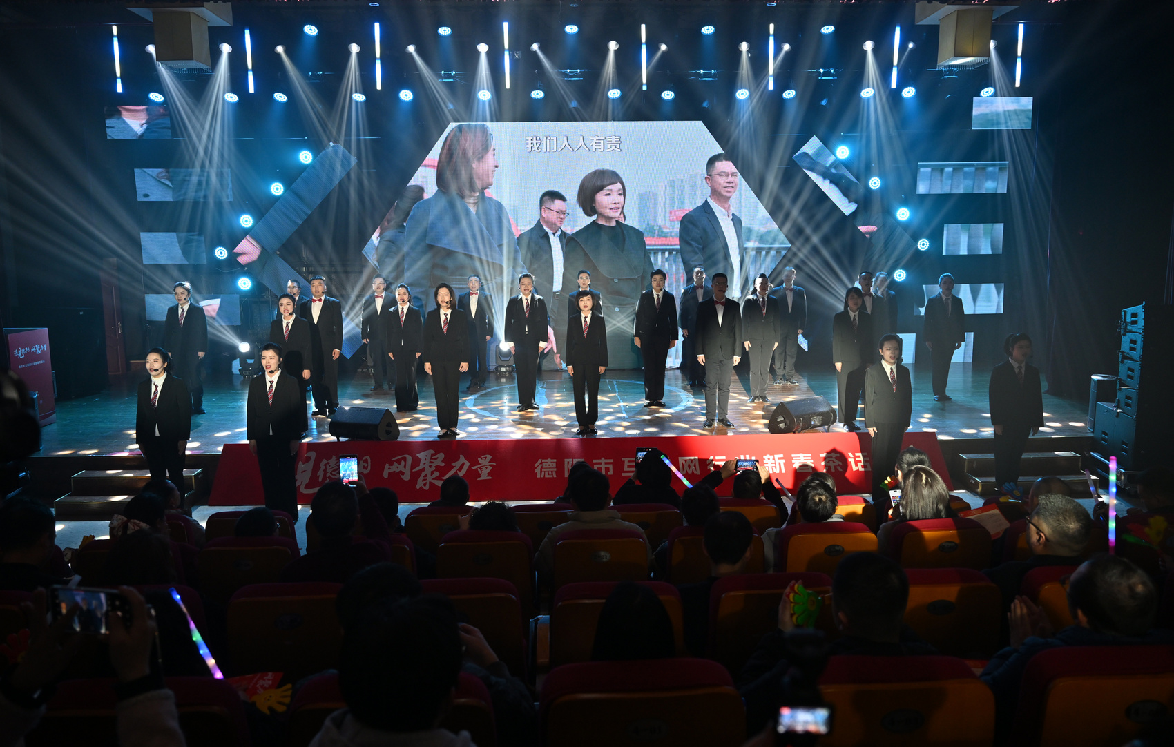 值得一提的是,在本次活动现场,德阳市委网信办干部及科室骨干代表携手登台,以一曲激昂的《云端守护者》大合唱点燃全场。这首由德阳本土著名词作家陈道斌作词、罗其鹏作曲、音乐人谭艳演唱的歌曲,曾作为2025年四川省网络安全宣传周的官方主题曲在全省网民间广泛流传,而此次在新春茶话会上再度唱响,则是德阳网信将网络安全宣传从专项活动向日常场景延伸,实现了“宣传+文艺+行业凝聚”的有机结合。