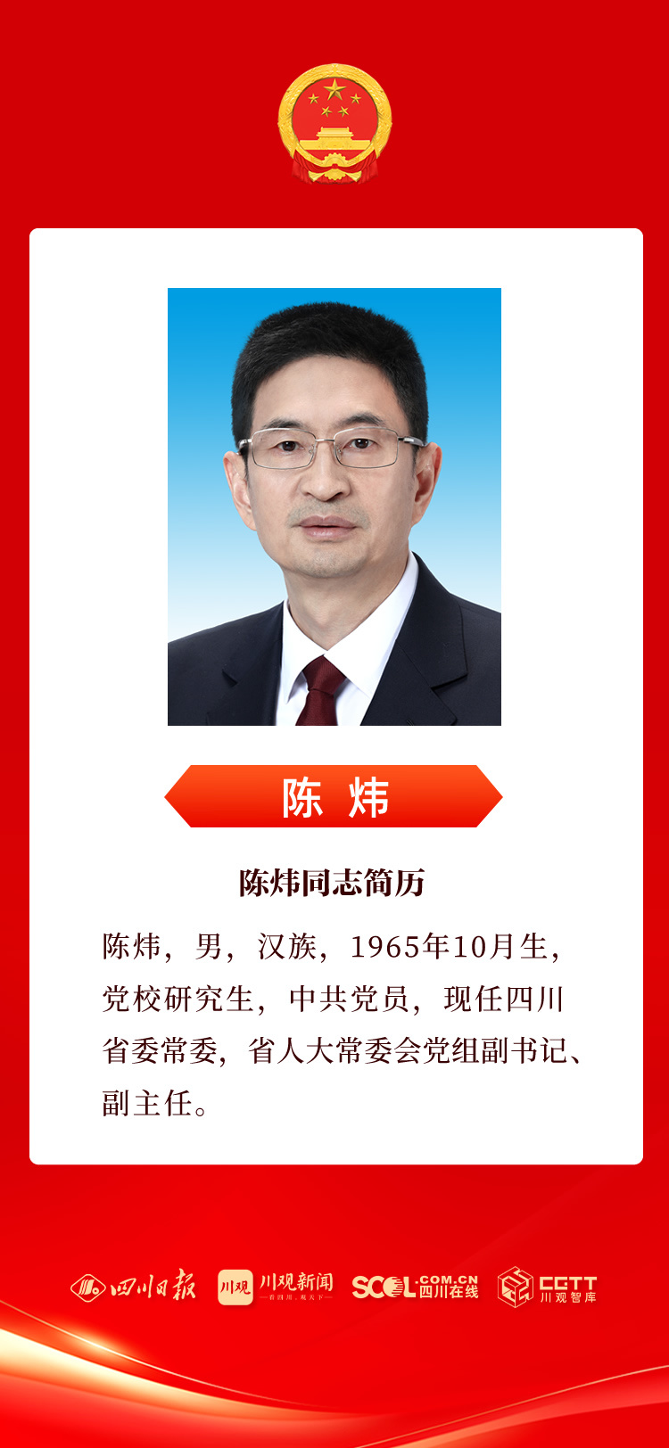 2月7日下午举行的四川省第十四届人民代表大会第五次会议第三次全体会议,选举陈炜为四川省第十四届人民代表大会常务委员会副主任。