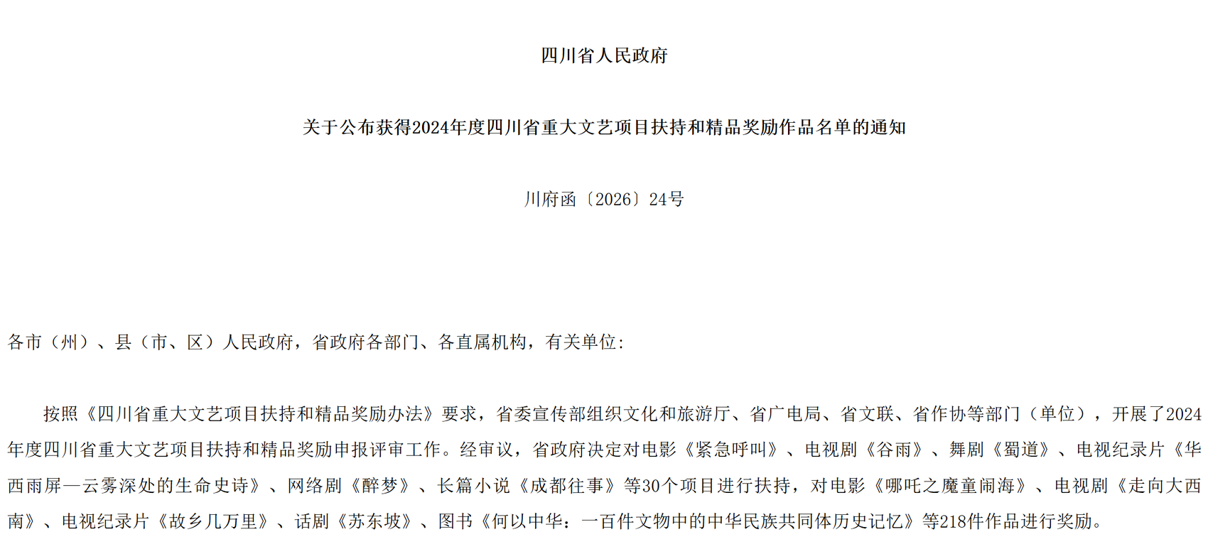 2月7日,四川省人民政府网站公布《四川省人民政府关于公布获得2024年度四川省重大文艺项目扶持和精品奖励作品名单的通知》。