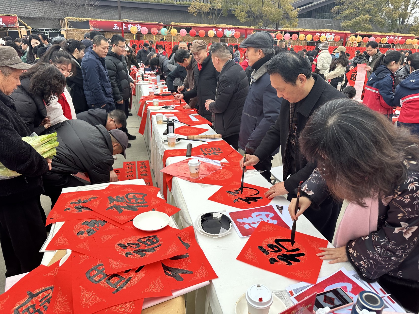 不止机器人。活动现场共有书法家、书法爱好者及中小学生等500余人同写春联送祝福。书法家们行、楷、隶、篆各体兼备,一停一顿、一起一落间,写下“春临大地百花艳,节至人间万象新”等一幅幅寓意吉祥的春联;孩子们神情专注,一笔一画书写着对新年的纯真祝愿。据统计,现场书写并赠送的春联与“福”字超过5000幅,直接参与活动的市民游客逾万人次。