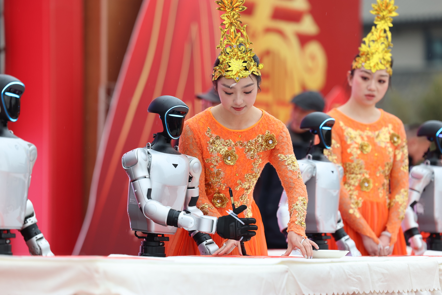 宇树机器人与书法家们同台写春联。(白桂斌 摄)