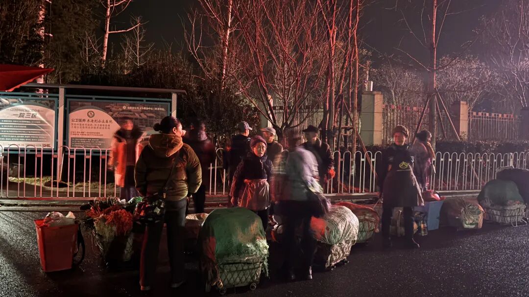 2月5日清晨5时38分,菜农聚集在下坝镇谷坝村252路公交车站台,准备进城卖菜。
