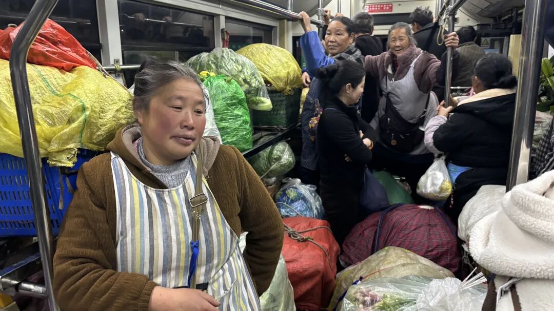 5时50分,252路公交车缓缓进站。“慢慢嘞,不急哈!”司机陈树山打开车门,引导菜农有序地将菜筐菜篮搬进车厢。几十人的队伍,排在最前面的燕姐双手一提,菜篮稳稳落在膝盖上,顺势一顶便进了车门。