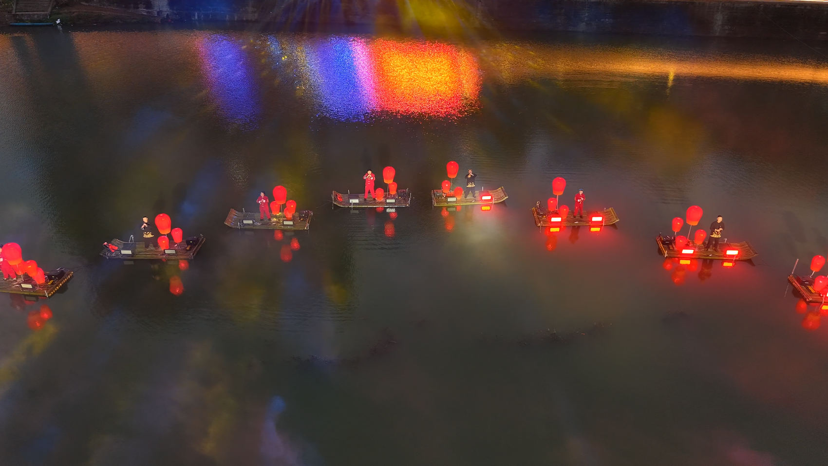 水上,12位唢呐艺人伫立竹筏之上,合奏出唢呐水上交响乐,非遗古韵穿透夜空、直抵人心。