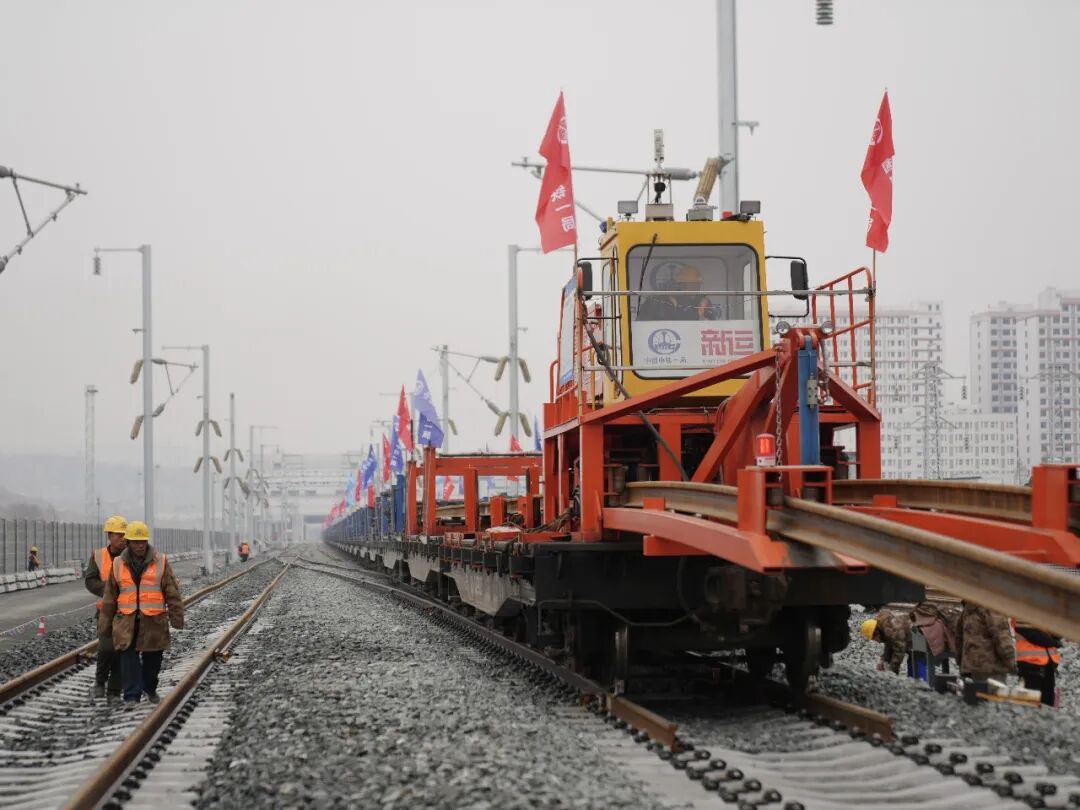 2月6日,在陕西安康西站铺轨现场,随着最后一对钢轨精准落位并完成锁定,标志着西康高铁全线轨道铺设顺利完成,全面转入线上施工和联调联试准备阶段,为后续开通运营奠定了坚实基础。图为中铁一局施工人员在西康高铁安康西站段铺轨现场作业。(新华社记者 赵英博 摄)