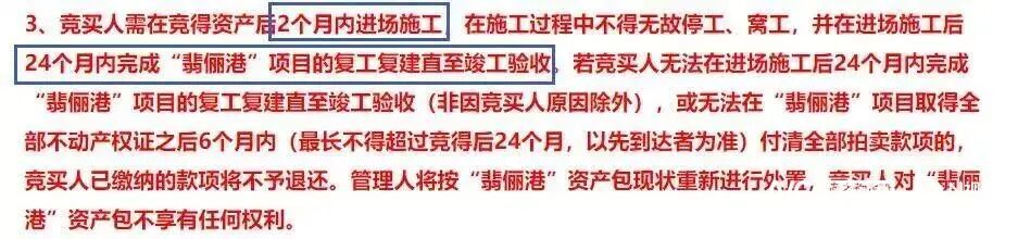 为保障翡俪港顺利重启,本次拍卖设置了时间条款与违约约束。竞买人需在竞得资产后2个月内进场施工,并在进场施工后24个月内完成“翡俪港”项目的复工复建直至竣工验收。若竞买人无法在进场施工后24个月内完成“翡俪港”项目的复工复建直至竣工验收,或无法在“翡俪港”项目取得全部不动产权证之后6个月内付清全部拍卖款项的,已缴纳的款项将不予退还。管理人将按“翡俪港”资产包现状重新进行处置,竞买人对“翡俪港”资产包不享有任何权利。