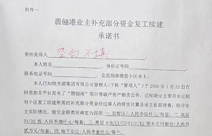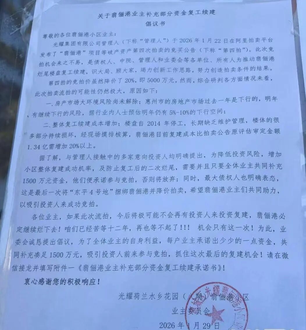 为保证此次竞拍成功,翡俪港业主还众筹了部分复建资金。此前,翡俪港小区业委会发布了《关于翡俪港业主补充部分资金复工续建倡议书》,呼吁全体业主共同筹集1500万元资金,作为复工续建的补充资金。