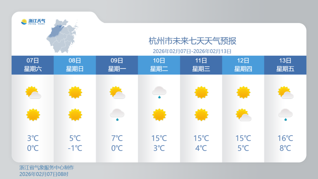 展望后期天气,暖湿气流依旧活跃,杭州将迎来晴雨相间的天气节奏,9日夜里至10日、13日至16日有两次弱降水过程,整体降水强度不大,气温逐渐回升。